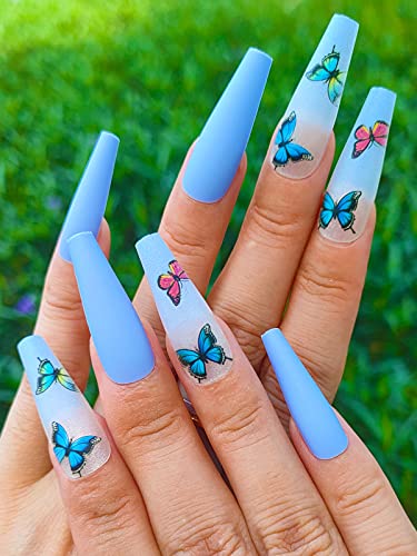 Butterfly nails are going to be everywhere this year (remember what I said about the return of the 2000s) and butterfly graphics look great atop these light blue and white ombre long nails.
