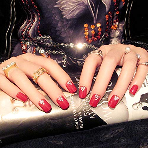 For example, you can play with rhinestones to when doing a classy look. It’s just about using them as small accents rather than bold statements. Also, don’t worry about having to stick to plain colors — I love the idea of using solid colors, as seen on these red press-on nails with rhinestones.